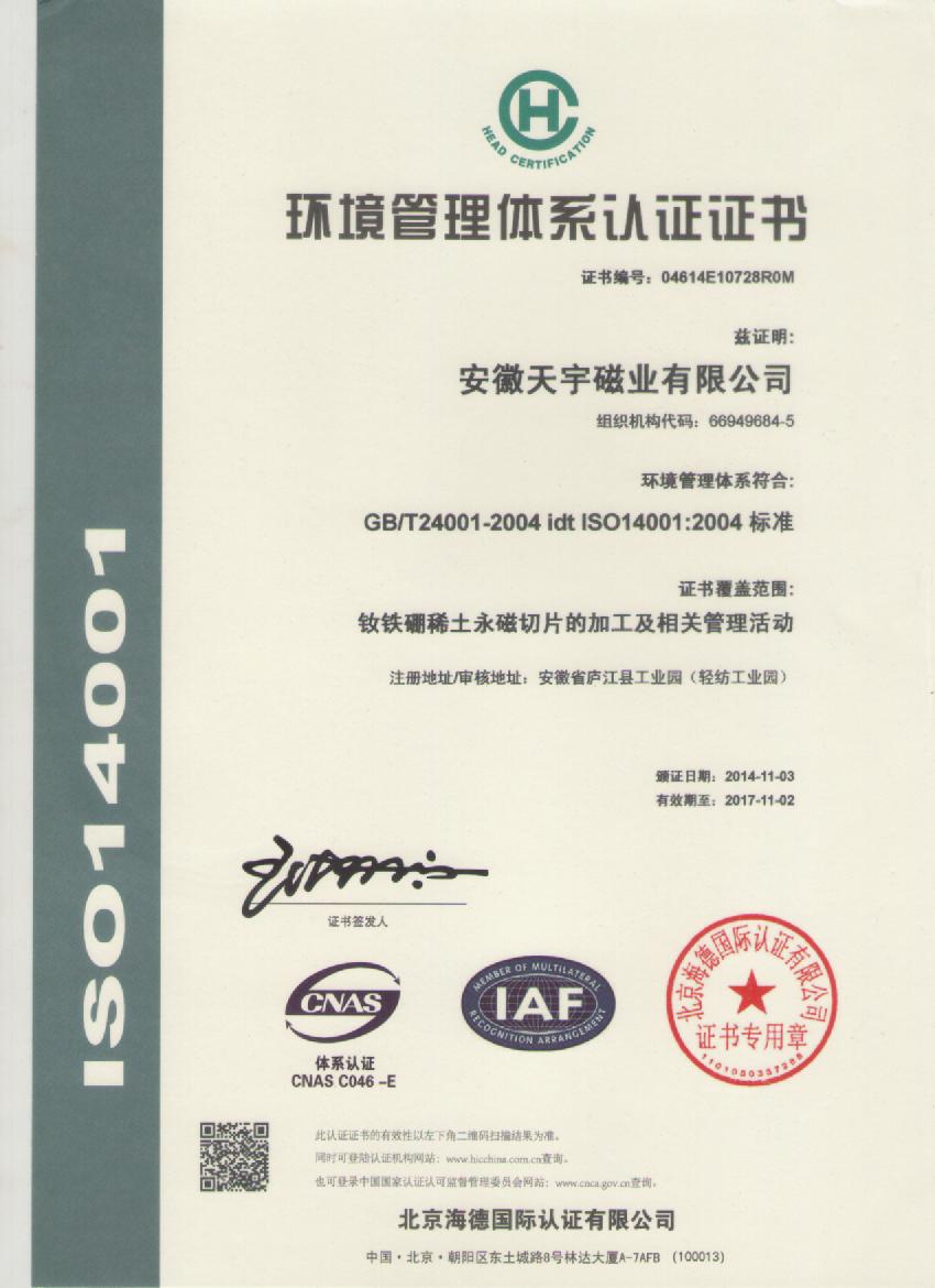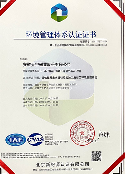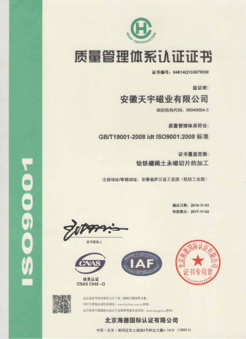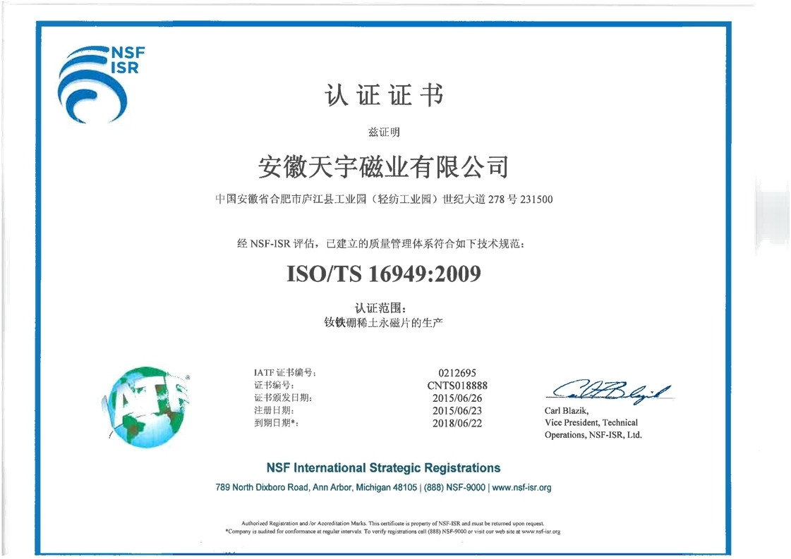 安徽天宇磁业股份有限公司成立与1997年7月1日,前身是香港协和实业总部下设广东珠三角地区的东莞市惠恩磁铁有限公司;惠恩公司创立与上世纪九十年代中期,经过一批年轻的惠恩人秉承 “有所为,有所作为”的时代追求;以孜孜不倦、脚塌实地、一步一个脚印的必胜信念。